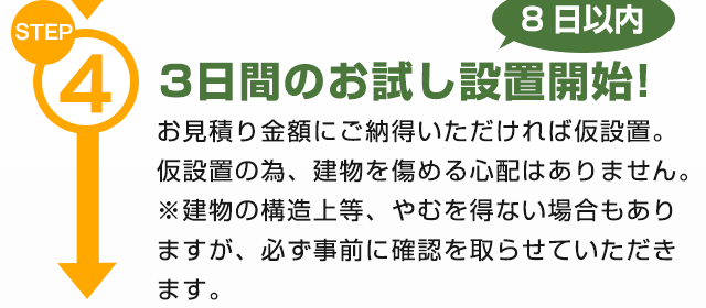 ※使用料、仮設置費用、撤去費無料はお試し期間の
